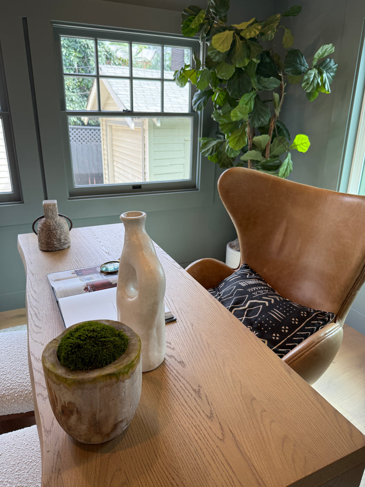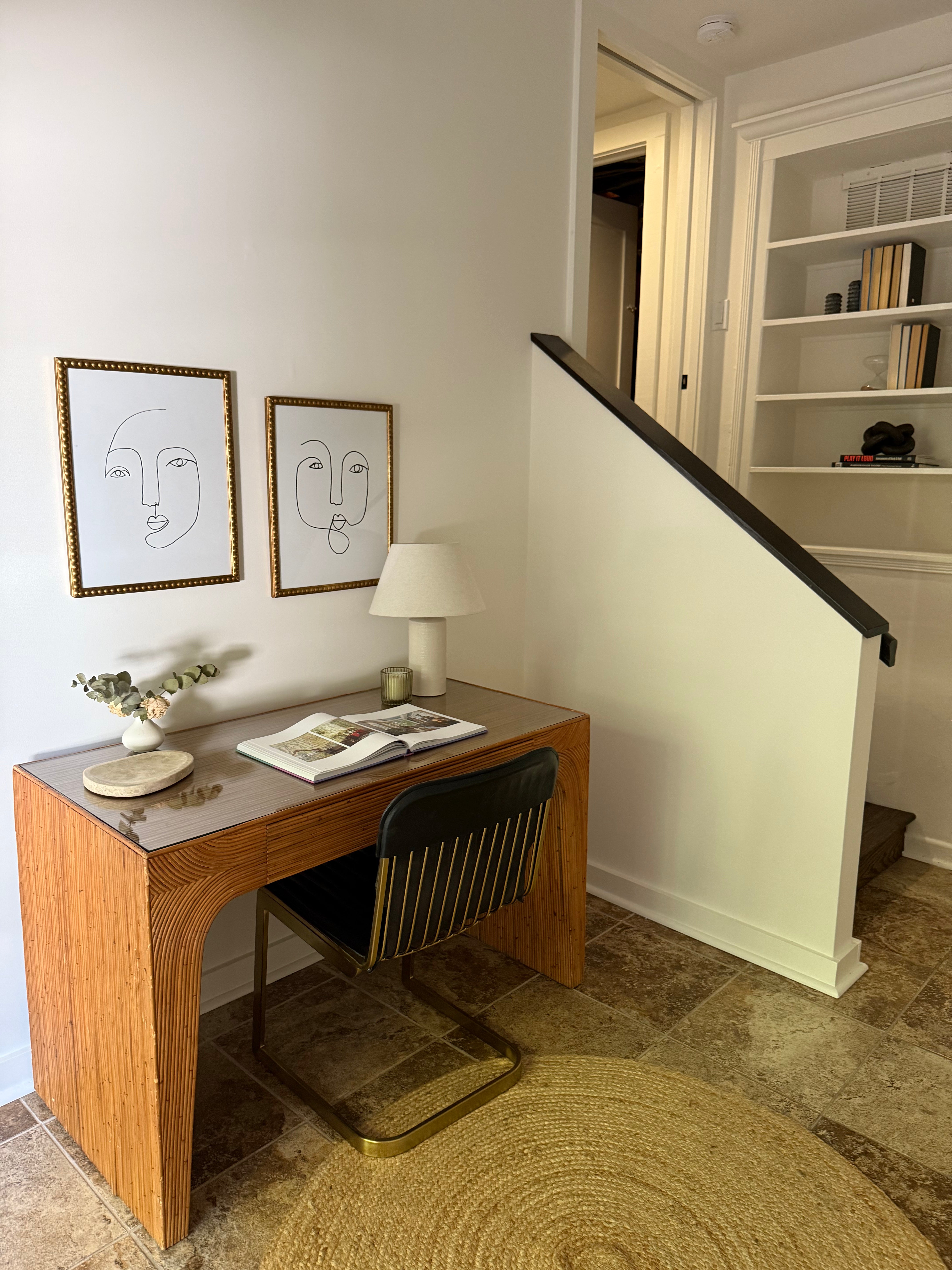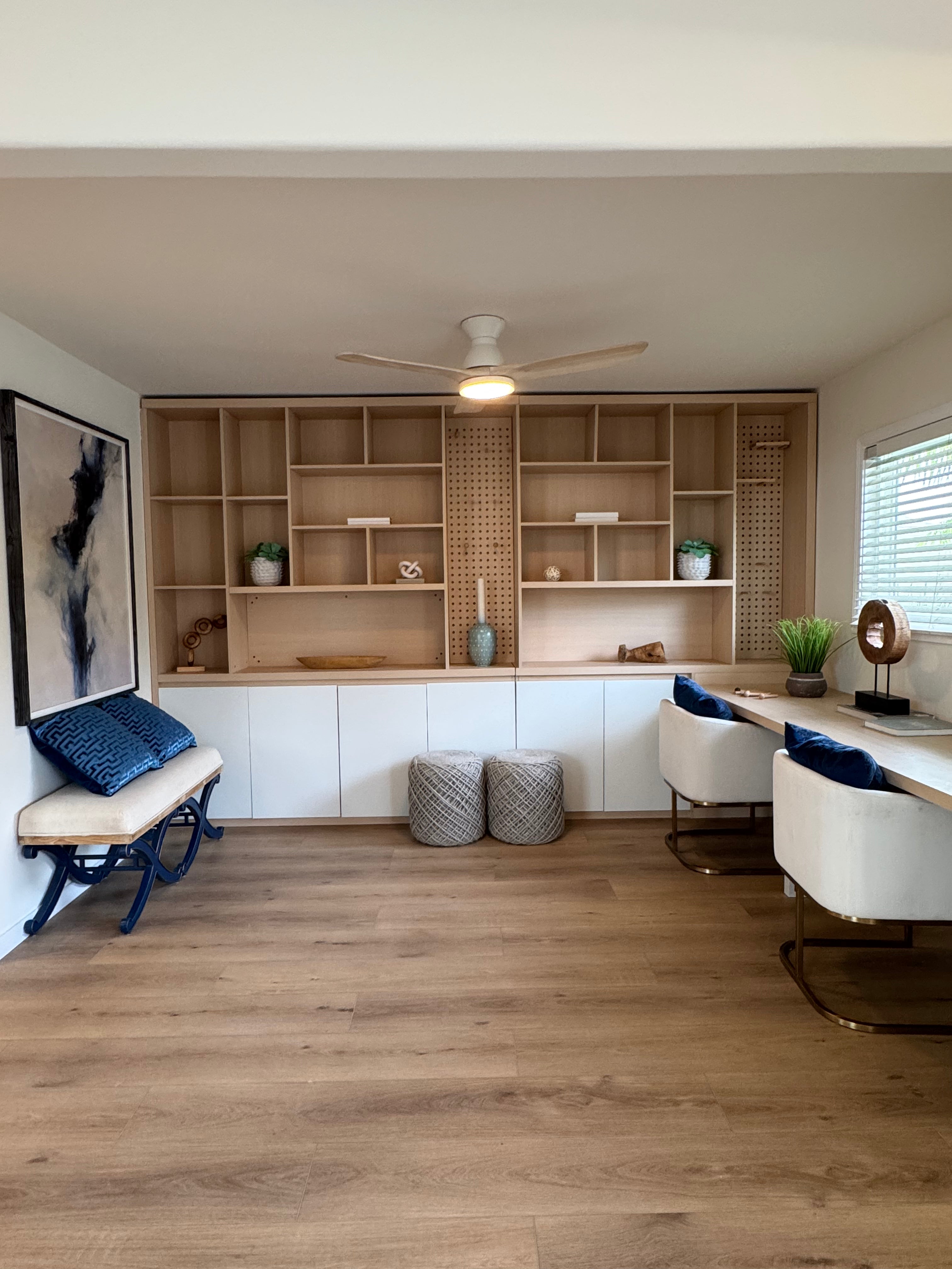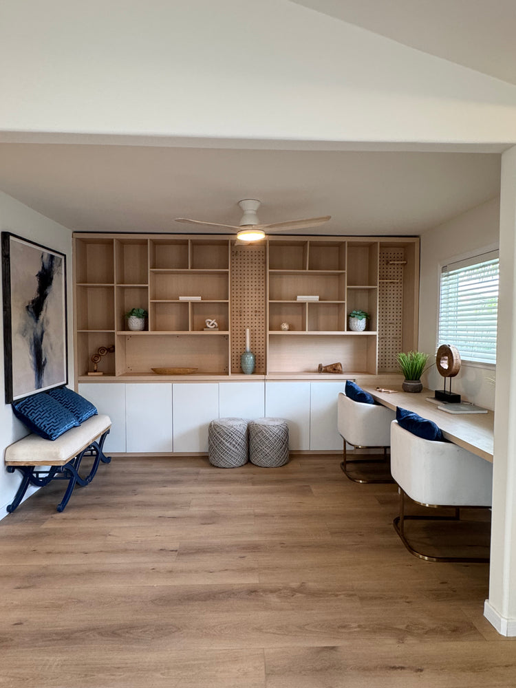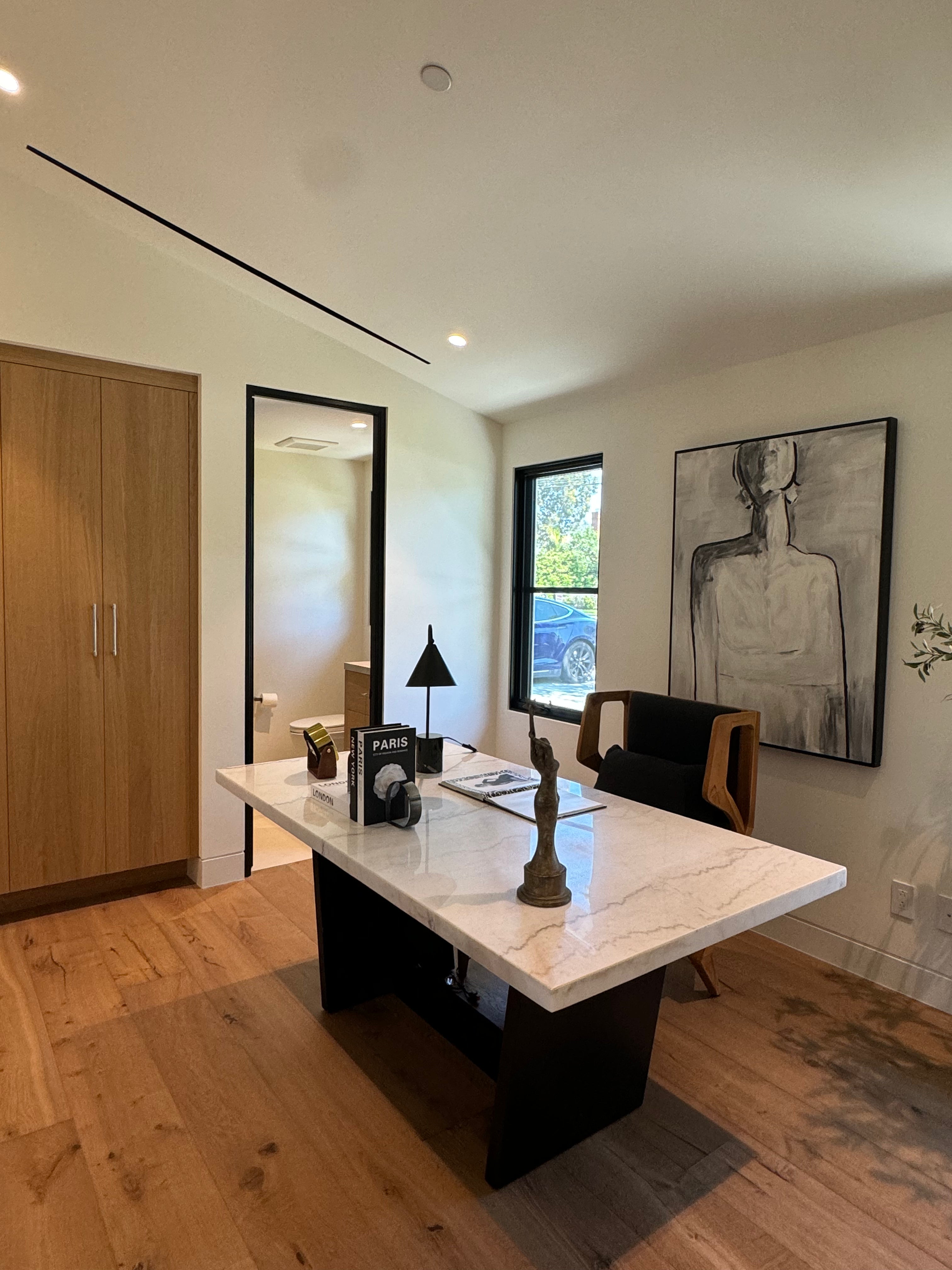 Home office design centers on integrated storage and tailored work surfaces. Custom bookshelves and custom desk are configured to support organization, productivity, and material continuity within the space.