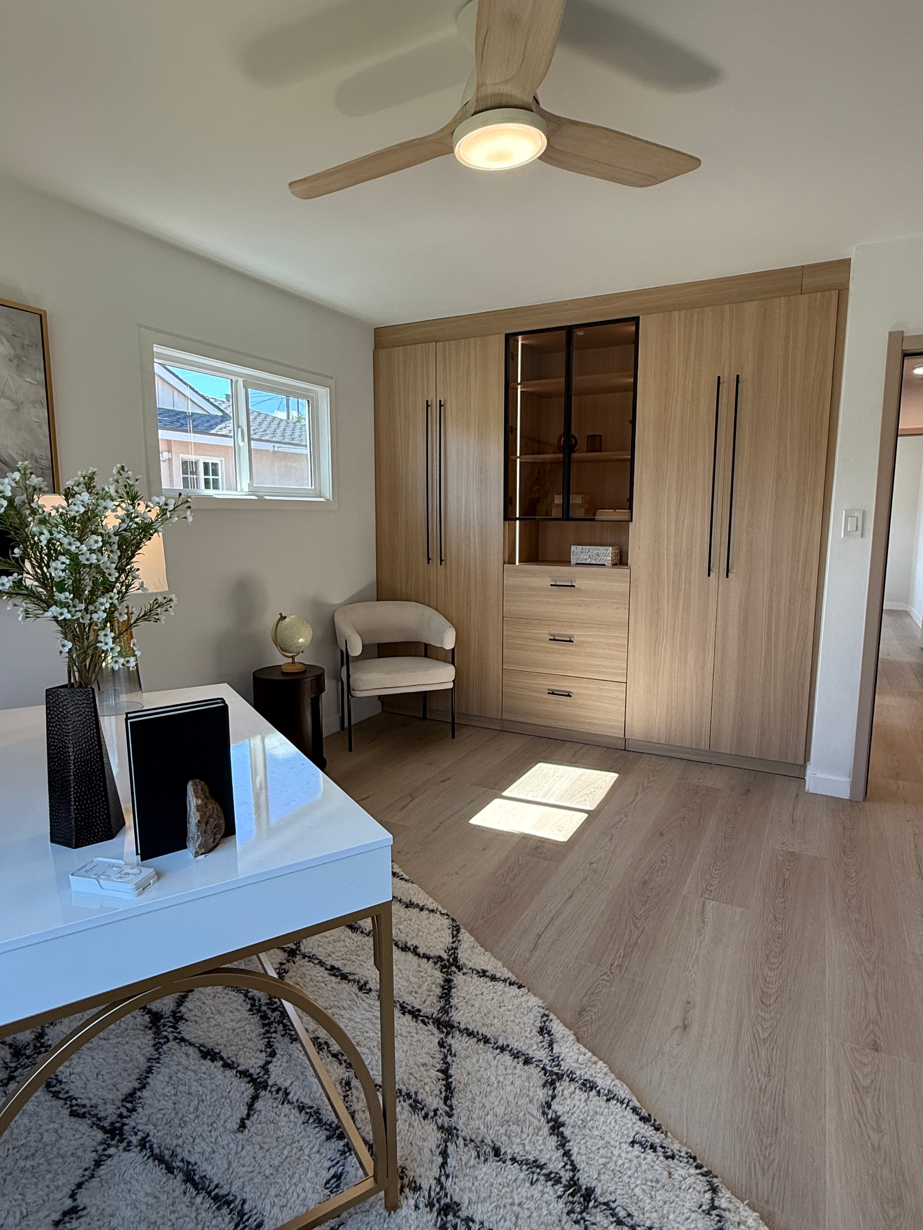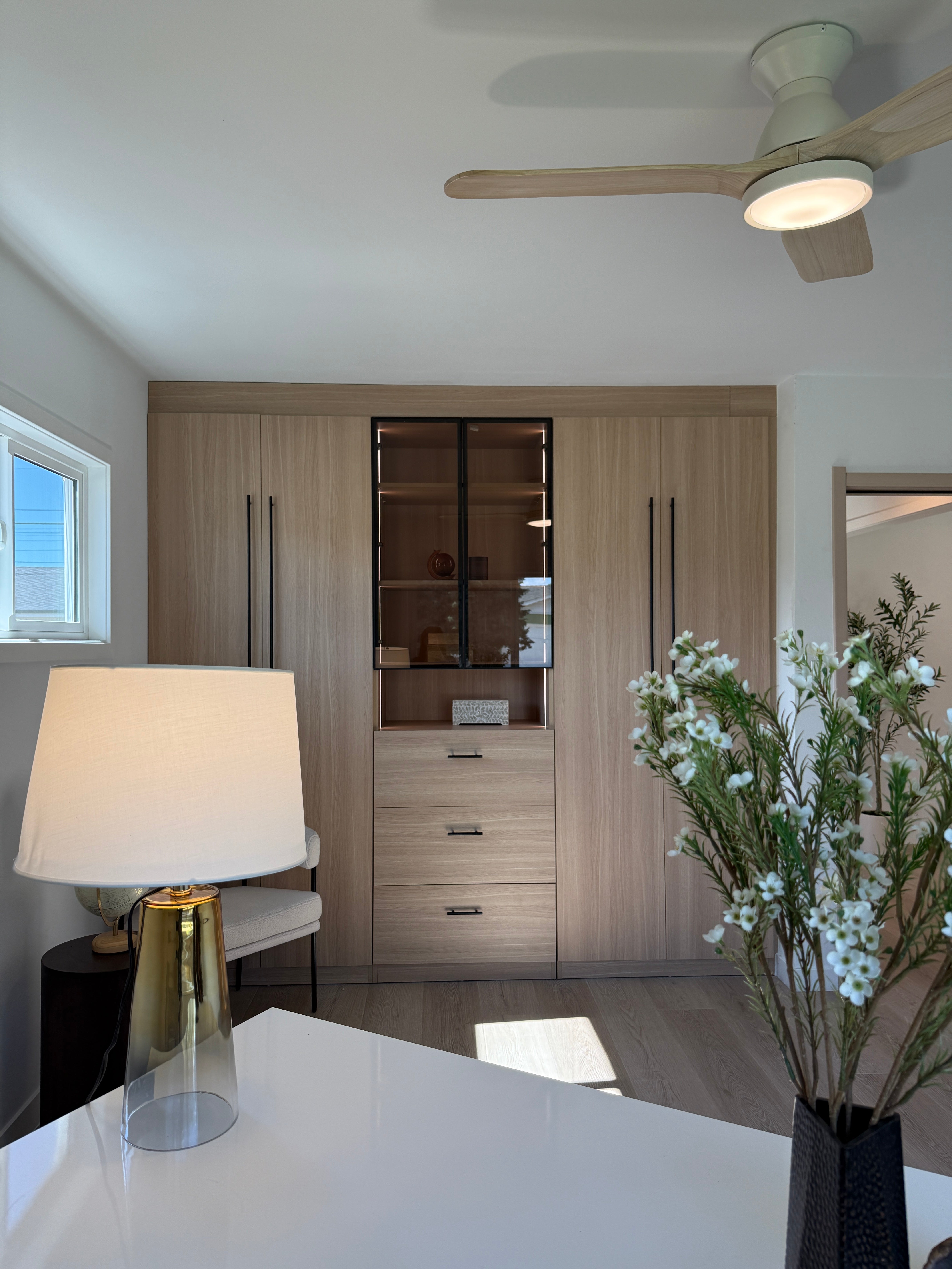 Cabinetry dimensions, shelving proportions, surface finishes, and hardware selections are coordinated to align with room size and daily usage. Rather than relying on standalone furniture, storage and workspace elements are designed as cohesive architectural systems that enhance both function and visual clarity.