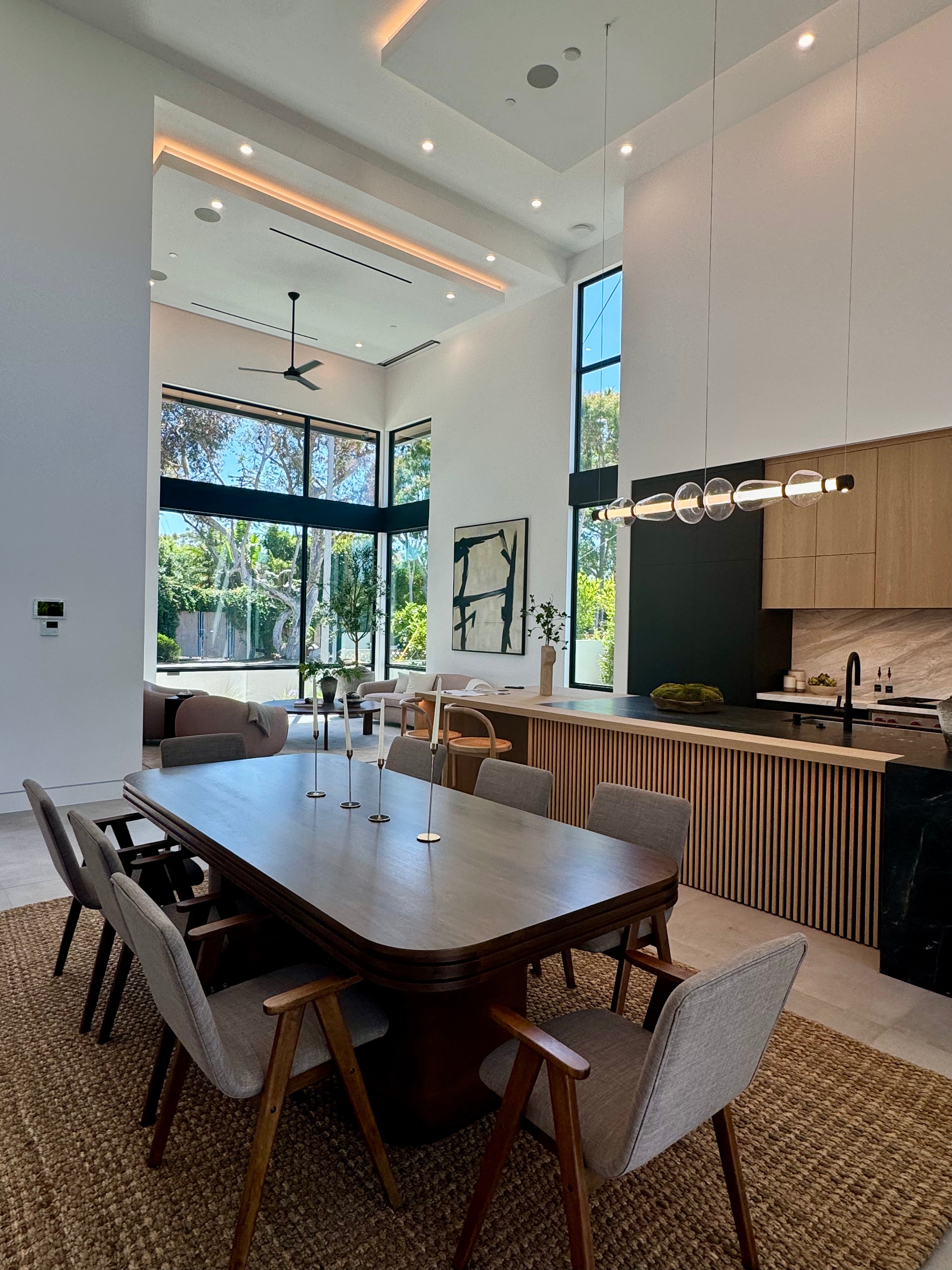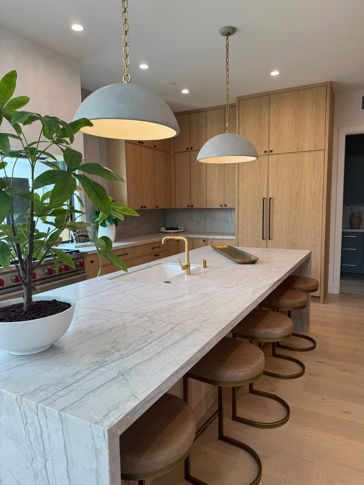 Pendant lighting can be specified or custom-selected based on island width, seating layout, material palette, and desired lighting temperature.